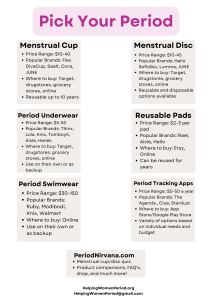 Here are the alternative menstrual products we have vetted. Please be sure to visit the website PeriodNirvana.com - she has amazing short videos that explain more than you ever thought possible about periods!